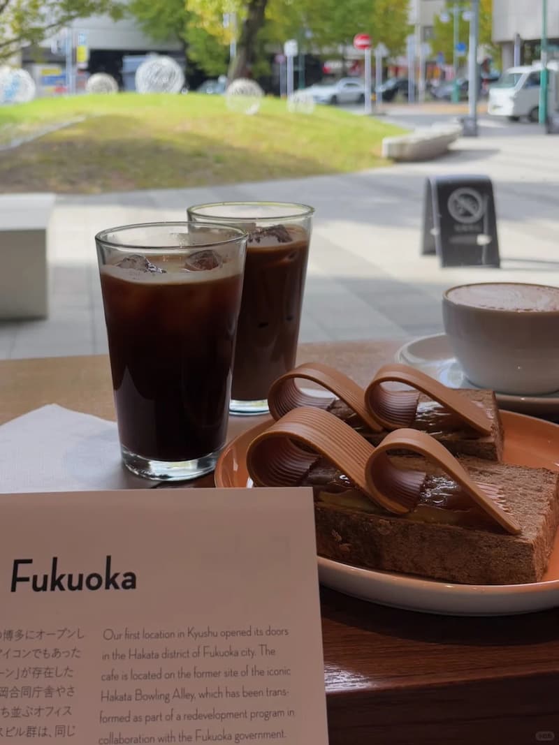 如果你是咖啡控,來福岡一定不能錯過 Fuglen!這家源自挪威奧斯陸的傳奇咖啡品牌,1963 年創立,曾被《紐約時報》評選為「世界上最好喝的咖啡」和「最值得搭飛機去品嘗的高品質咖啡」。推薦大家可以試試看羊奶吐司、冰拿鐵、美式咖啡,Brown cheese 濃郁的奶香搭配酸麵包,口感層次豐富,完全讓人一口接一口。冰拿鐵的味道也很驚艷,比一般在台灣喝到的咖啡更濃烈,香氣十足;拿鐵口感絲滑、奶泡綿密,美式則帶著微微果香,喝起來清爽又帶厚度,完全證明 Fuglen 的咖啡水準果然名不虛傳。如果來福岡旅遊,這家絕對值得列入咖啡踩點清單!
