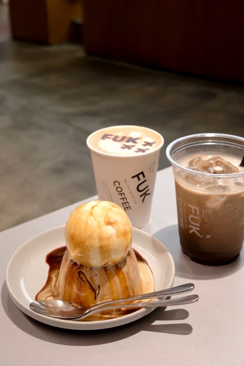 在福岡超火的 FUK Coffee,地點就在博多運河城附近,從外觀就超級吸睛,路過很難不被抓住目光!招牌就是焦糖拿鐵和冰淇淋布丁,布丁吃起來香濃 Q 彈,焦糖味、蛋香十足,必點招牌焦糖冰淇淋布丁組合:焦糖醬像熔岩般包裹著 Q 彈布丁,搭配香草冰淇淋球,冰涼奶香完美融合。小秘密吃法是,把布丁剩下的焦糖醬倒進焦糖冰拿鐵,立刻升級成雙倍焦糖暴擊,香甜濃郁到讓人停不下來~如果來博多運河城附近,不妨到這家店來踩點!