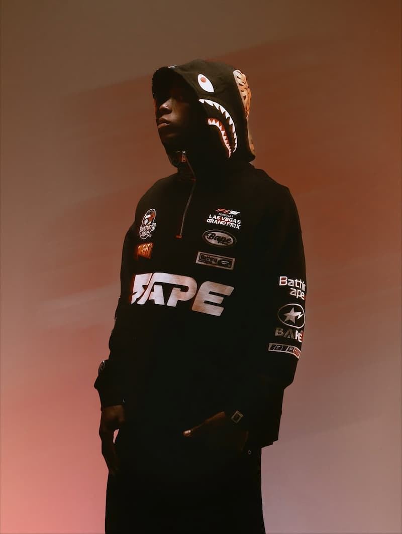 這次的 BAPE® × F1 Las Vegas GP 膠囊系列單品包含帶有經典鯊魚頭的半拉鍊式連帽上衣、佈滿品牌 Logo 布章的教練夾克、猿人 Logo Tee、六分割帽款與重頭戲的 BE@RBRICK 收藏玩偶(有 100% 與 400% 尺寸)等,整體系列單品將街頭張力與極速感完美融合。