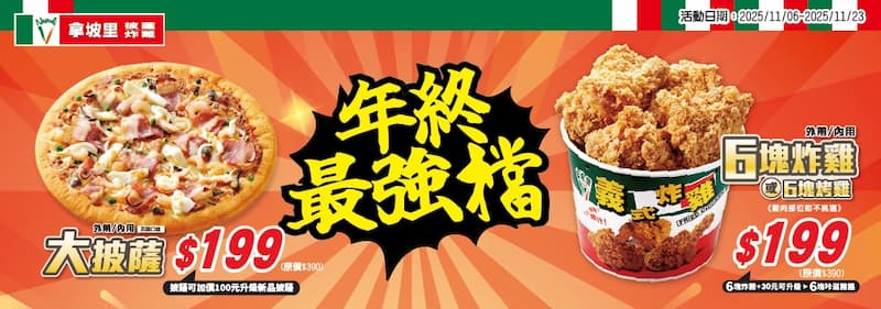 拿坡里披薩‧炸雞 11 月 6 日至 11 月 23 日,內用/外帶大披薩或六塊炸雞特價 199 元。