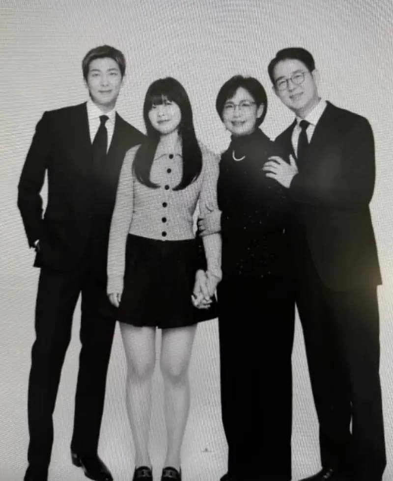 BTS 防彈少年團隊長 RM 罕見放送家人合照,引起全球粉絲一陣驚呼。這位以穩重與高智商著稱的偶像,出道十多年幾乎從未公開過家庭照,沒想到近日竟在社群平台大方上傳兩組全家福。照片以黑白色調拍攝,一家四口穿著呼應的服裝,畫面既有設計感又不失溫度,讓粉絲直呼「太像畫報」。在第一組照片中,RM 和父母、妹妹都穿著同品牌的運動外套,一致地靠在一起,連姿勢都完美同步,散發出自然的默契。第二組則換上正式服裝,RM 與爸爸穿著西裝,媽媽與妹妹則以針織衫與洋裝呼應,氣質沈穩又知性。網友紛紛留言:「全家氣場好一致」、「這組照超有韓劇感」。