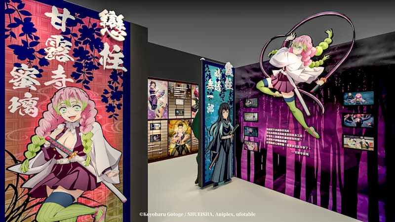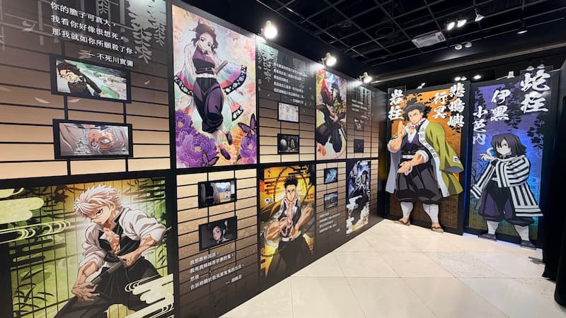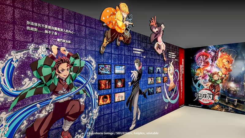 展區集結《竈門炭治郎立志篇》、《無限列車篇》、《遊郭篇》、《刀匠村篇》及《柱訓練篇》各季 TV 動畫的動人台詞與精采畫面,鬼殺隊最高戰力九柱的等身立牌,無限列車篇中炭治郎使出「火之神神樂 碧羅之天」斬向魘夢脊骨的經典戰鬥場景,邁向無限城展區中鏡面交錯的反射身影,以及無慘、黑死牟、童磨、猗窩座、鳴女齊聚,以無限城進行設計的商售區,絕對都是攻佔粉絲手機記憶體的必拍畫面。