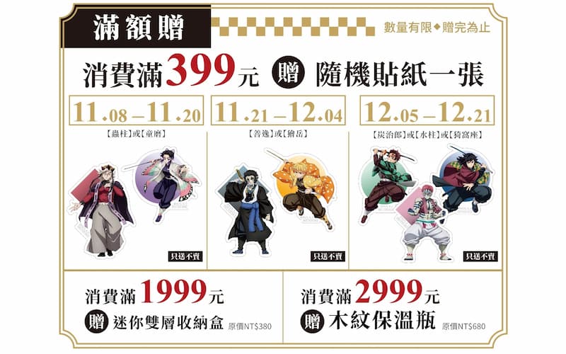一抽只要 300 元的大扭蛋機,所有獎項都是《鬼滅之刃》的特色商品,最大獎價值超過千元,快來試試你的好手氣,把大獎通通帶回家。為了回饋南臺灣粉絲的熱情,這次高雄站也帶來超好康的滿額贈活動,消費滿 399 元,就可以獲得只送不賣的角色造型貼紙,第一波是 11 月 8 日到 20 日,蟲柱或童磨隨機一款;第二波是 11 月 21 日到 12 月 4 日,善逸或獪岳隨機一款;最後一波是 12 月 5 日到 12 月 21 日,炭治郎、水柱、猗窩座隨機一款,想要蒐集的朋友請好好記住以上日期。現場消費滿 1999 元、2999 元還有不同的滿額贈好禮,但都是數量有限贈完為止,想要擁有的朋友趕快設好行事曆跟鬧鐘,11 月 8 日就到夢時代購物中心,與我們一起邁向無限城!