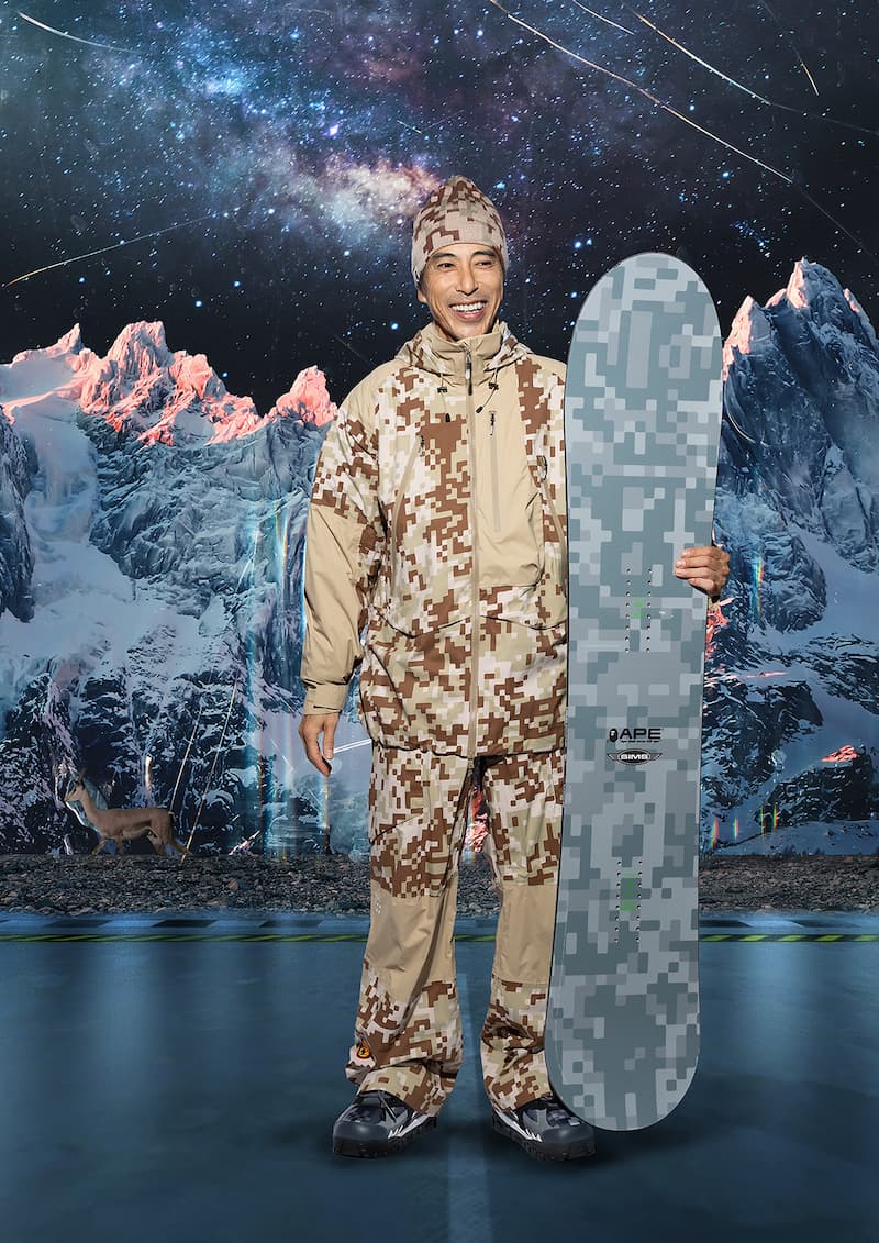 陳冠希以其標誌性的叛逆型格,酷感示範雙層滑雪套裝;說唱歌手 KANEEE 則為 DIGITAL ABC CAMO 戰術套裝注入超燃街頭氣場。JESSE 身著羊羔絨可拆卸教練夾克搭配長褲,演繹清新運動風尚;而廣山直人(ORANGE RANGE 成員)則以圓領衛衣展現極簡主義的精髓。系列作品運用創新迷彩與高科技面料,構築從頭到腳的完整造型,彰顯先鋒設計與技術創新。