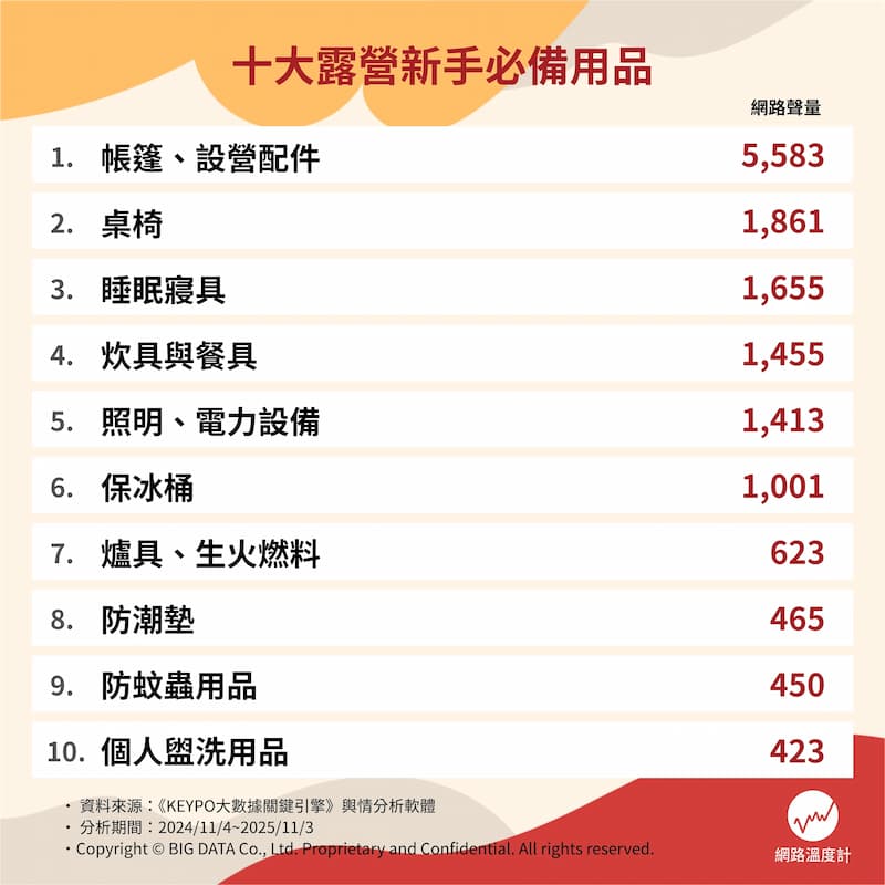 秋季與初冬正是露營的黃金季節,氣溫宜人、風景絕美,正是親近大自然、追紅葉露營的最佳時刻;但對新手來說,現實往往骨感,從忘記帶睡墊、帳篷搭不穩,到半夜冷到睡不著,浪漫瞬間變成狼狽現實。《網路溫度計DailyView》先前曾盤點過話題度爆棚的「北台灣10大超夯露營區」以及「10大懶人露營地」,從免費營地到輕奢系神殿帳通通有,帶領露友挖掘最夯的露營景點。這回我們為了幫新手避開踩雷,再次透過《KEYPO大數據關鍵引擎》輿情分析軟體,整理出「十大露營新手必備用品」,帶你掌握露營入門關鍵清單。希望第一次露營不再手忙腳亂?這份清單一定要收好!