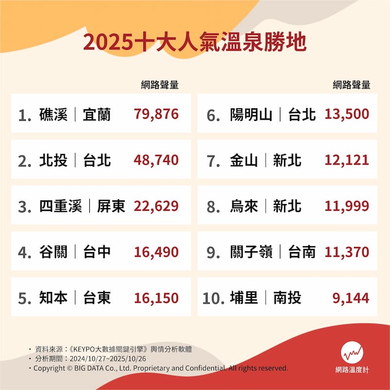 時序入秋,微涼的空氣逐漸取代盛夏的悶熱。每當氣溫驟降,泡湯便成為許多人心中最療癒的首選行程。浸泡在熱氣氤氳的溫泉中,看著白霧緩緩升騰,不僅能驅散全身的寒意,也能趕走整日的疲憊。素有「溫泉王國」之稱的台灣,地熱資源相當豐富,除了保養皮膚的美人湯、牛奶湯外,還有相當罕見的泥漿溫泉,每一處泉質各異,再加上坐擁山林溪谷的優勢,因此成為不少國人秋冬休憩的最佳去處。《網路溫度計 DailyView》透過輿情分析軟體《KEYPO 大數據關鍵引擎》,曾於 2024 年 11 月公佈「人氣溫泉勝地」排行榜,當時由礁溪、北投、烏來強勢包辦前三名,堪稱國人泡湯必訪的經典選擇,而谷關與知本也以優越的自然絕景緊追其後。時隔一年,今年再度啟動調查,2025 年的榜單是否會出現黑馬?傳統名湯能否繼續穩居高位?最新一輪的聲量排名馬上揭曉!