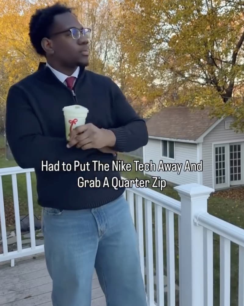 2025 年末,網路忽然出現一群穿著「半拉鍊式毛衣(quarter-zip)」的男人,手裡不是拿著咖啡,而是一杯抹茶拿鐵。他們在影片裡語帶自信、有點戲謔地宣告:「我們不穿 Nike Tech 那些小男孩的東西了。我們很優雅、我們很 classy。」這不是時尚品牌的廣告,也不是名人穿搭帶起的潮流,而是 TikTok 上全新的潮流與迷因,一種帶有自嘲意味的「男性進化」敘事。這波潮流以「Quarter Zip Dude」「Quarter Zip vs. Nike Tech」「Quarter Zip and Matcha」等標籤快速蔓延,起源於 TikToker Jason Gyamfi (@whois.jason) 的一支爆紅影片。影片中他把半拉鍊式上衣+抹茶的組合包裝成一種「升級版男性」的象徵,把穿 Nike Tech 套裝的自己視為過去式(在黑人 Hood 中他們常穿著運動套裝),並以調侃語氣講述那種「街頭小子」形象。影片發布後短短數日便突破百萬按讚,成為迷因界的新模板。