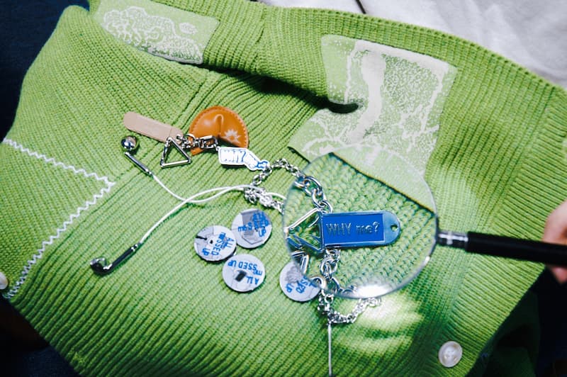 配件系列從易開罐、耳機線到幸運餅乾等生活符號出發,透過拆解、錯置與重組,轉化成幽默荒誕的造型反差。 Error Opener Belt 雙面拼接皮帶以金屬拉環取代傳統帶扣,在實用中藏入玩味。 Mute Mode Looped Chain 以耳機纏繞的凌亂為靈感,錯綜鏈節與 “Why me?” 吊牌具像化那份焦躁與無奈。 Temporary Luck Keychain 黑色幽默式的「幸運餅乾」鑰匙圈,結合彈孔、OK 蹦、拉環與 “Why me?”,讓命運的偶然被掛在腰間,荒謬卻真實。