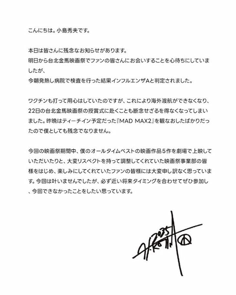 日本遊戲大師小島秀夫確診 A 型流感,原定出席第 62 屆金馬獎並擔任頒獎人,卻在典禮前 2 天臨時取消來台行程,讓許多期待與他見面的影迷相當失落。他透過金馬官方社群公開親筆信,說明病況並表達深深歉意。