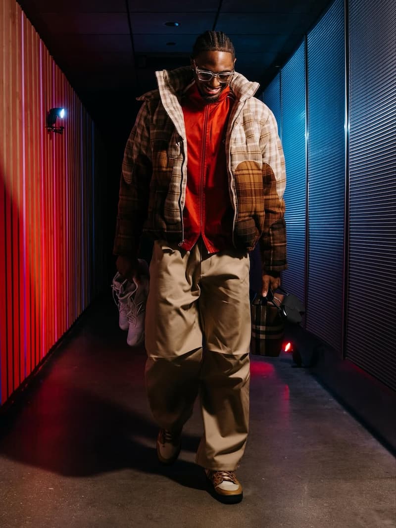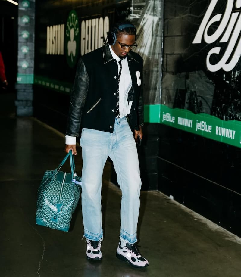 這套呈現 Maxey 最常見的「乾淨型男」範本:黑色棒球外套內搭白色上衣呈現簡約的視覺,下身搭配了刷淡的直筒丹寧褲呈現顏色上的跳脫,同時還與領帶的感覺互相碰撞,在休閒中又帶有點正式成熟感;而腳上的粉灰黑拼接球鞋增添街頭味,手上的綠色旅行包則讓造型瞬間再有亮點跳出。這可以說是球員通道裡最「平衡」的 Maxey。