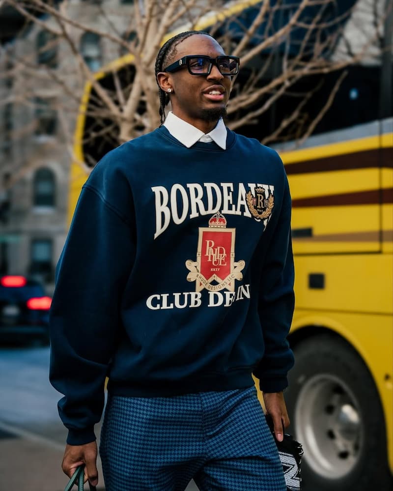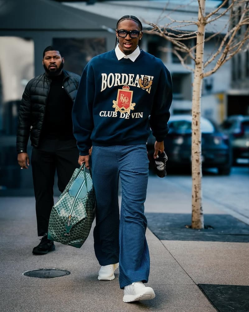 最後一套是最具 Maxey 個人風格的造型之一。深藍色衛衣搭配白襯衫內搭,營造純正的美式大學風,而 藍格紋寬褲 讓整身更有復古紳士味。手上的綠色手袋延續他對「大容量包款」的喜愛,整體既休閒又細膩。