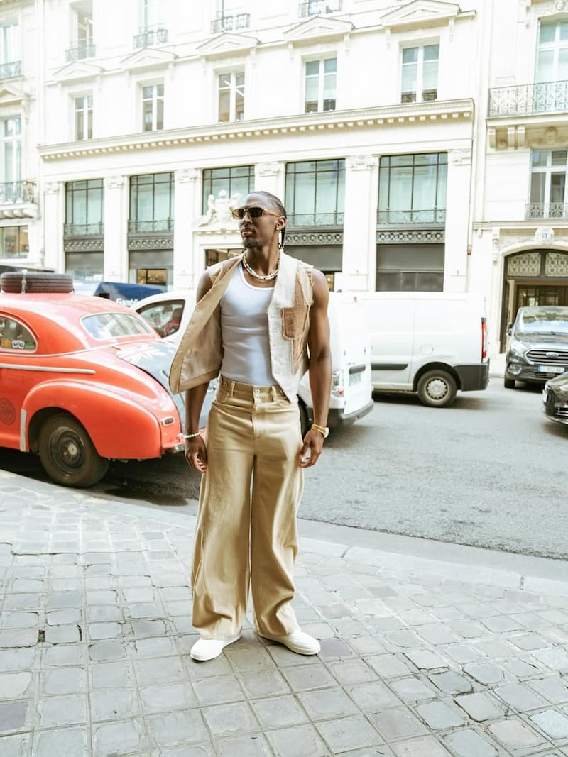 全身奶油卡其色色調讓整體視覺輕盈乾淨。卡其色的寬褲 多口袋造型背心的組合很有街頭休閒感,但整體的搭配方法讓造型依然簡潔也不會太浮誇,內裡的白色背心讓層次更清爽。而 Maxey 搭配的墨鏡與串珠項鍊,充滿法式街拍的自在氛圍。