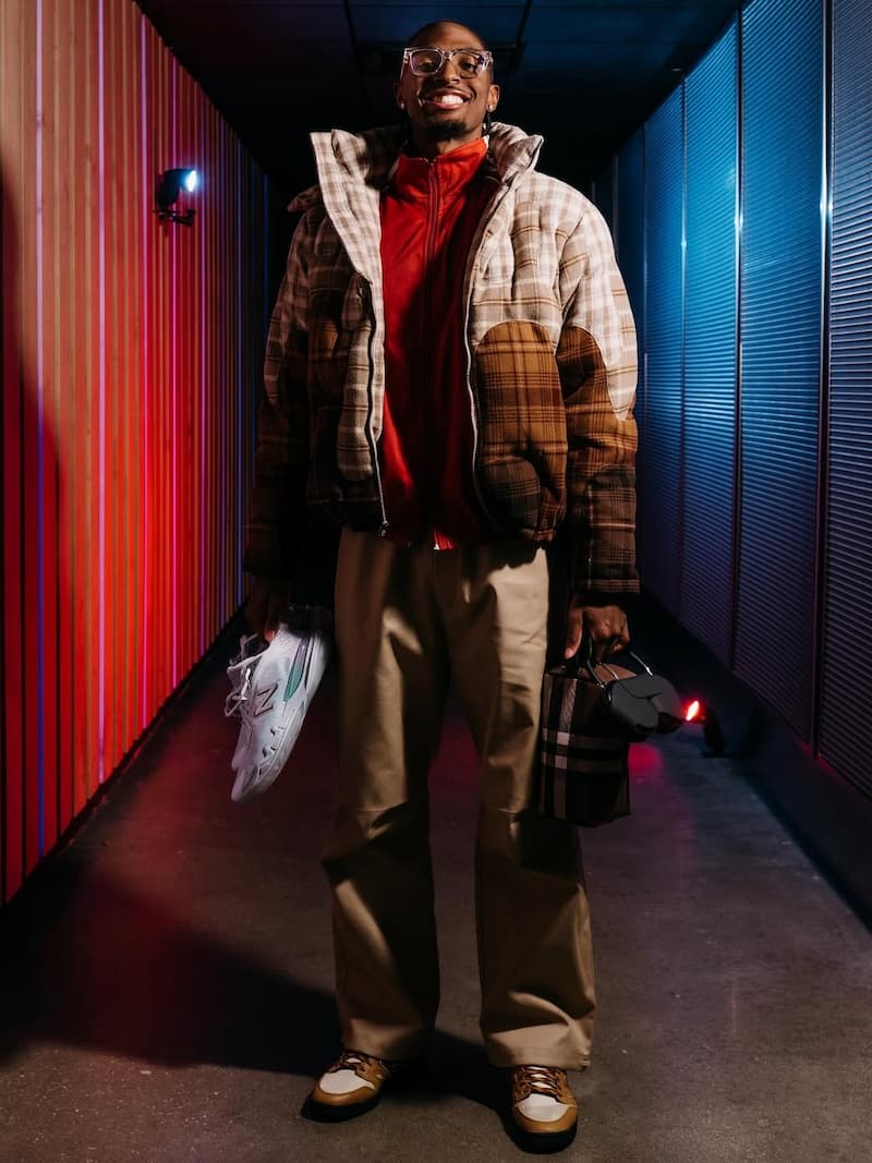 第一套造型展現 Maxey 在秋冬的層次感掌握。他外搭拼接格紋羽絨外套,內裡選擇亮紅色高領增加視覺重點,下半身以寬版卡其長褲營造鬆弛感。手提的 New Balance 球鞋與格紋小包讓整體多了溫度與細節,是非常具親和力又有個人特色且注重顏色配置的冬季 Look。