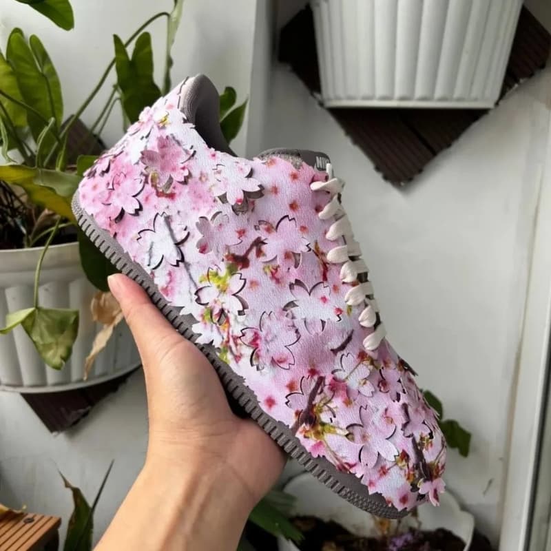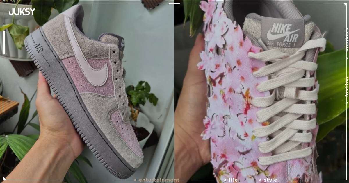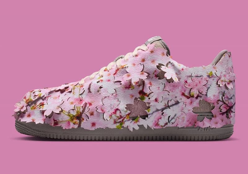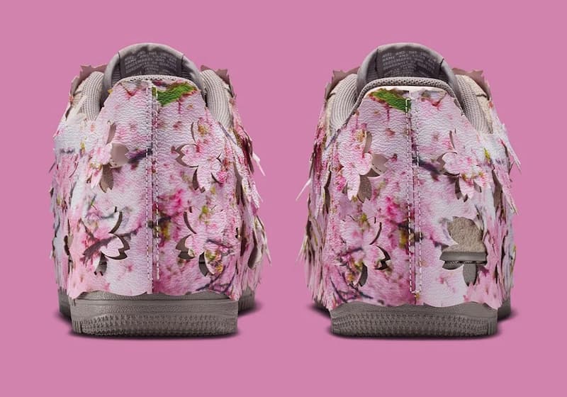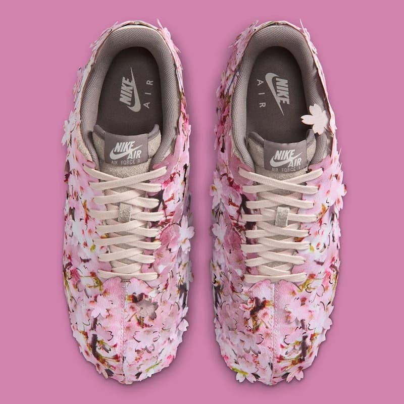 這雙全新的 Nike Air Force 1 Low「Cherry Blossom」顧名思義就是「櫻花綻放」,全鞋外觀覆蓋上滿滿的粉紅「仿真櫻花葉片」,形塑出鮮明繽紛的意象,有趣的是,這片櫻花外層貌似還是可拆式的,拆除後可以看到裏面是灰色與粉色麂皮呈現的鞋面,再次呼應櫻花的外觀特質。