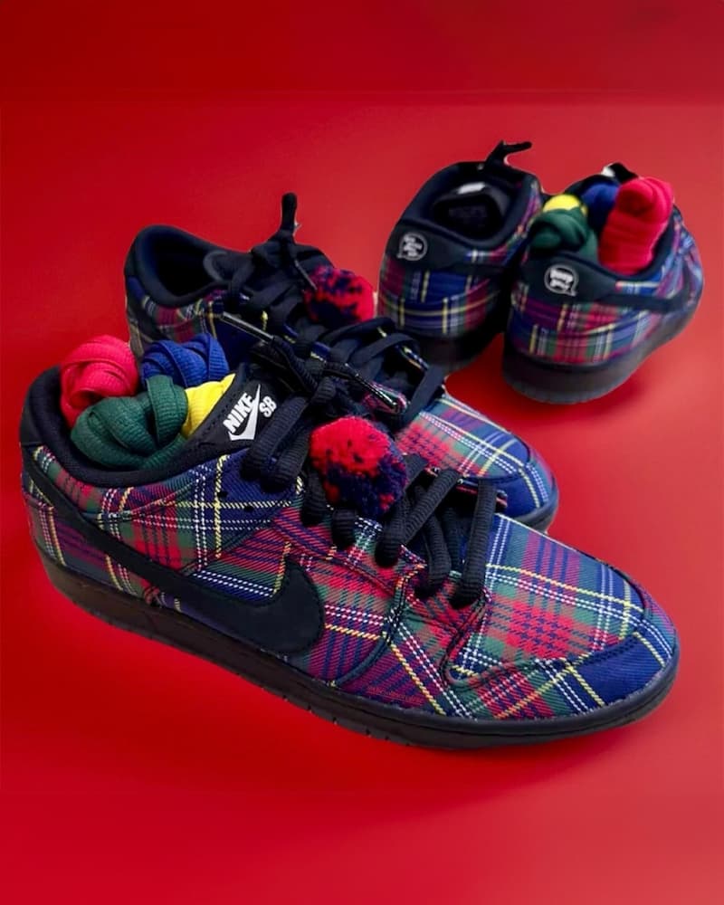 加拿大知名記者兼音樂家 Nardwaur 與 Nike 展開首次合作,發表 Nardwuar x Nike SB Dunk Low 聯名鞋款,鞋面採用多色格紋,忠實地還原了他標誌性的蘇格蘭圓頂帽。鞋帶頂端的絨球更添趣味,而他獨樹一格的穿衣風格也體現在此撞色鞋帶的設計中,鞋底紋路以及鞋跟處則印有他招牌的問答式簽名,鞋墊上 Nike SB 標誌上方也點綴著他的個人 logo。