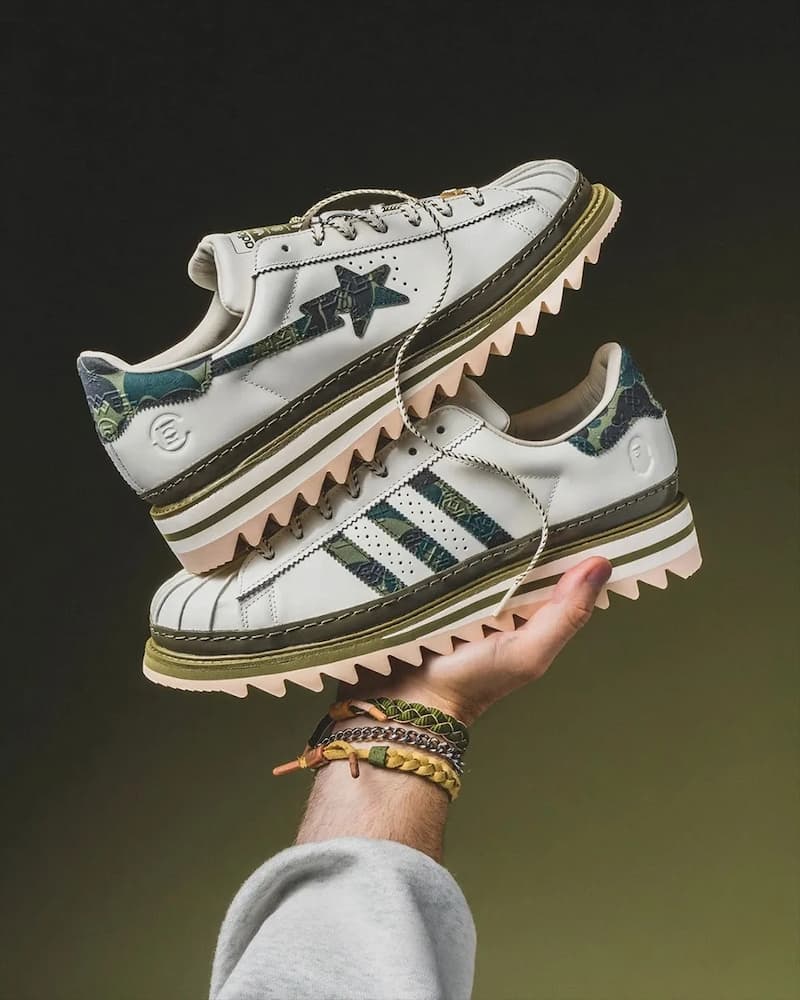 三方重磅聯名 BAPE x CLOT x adidas Superstar 正式現身,鞋面以白色作為主調,輔以綠色迷彩元素注入鞋身,上面還印有 CLOT Crest 標誌,同樣維持「不對稱設計」,右腳外側是 BAPE STA™ 星星 Logo、內側是 adidas 三條線標誌,左腳則是反過來對調呈現;貝殼頭設計保留 Superstar 的經典元素,鞋底也同樣延續了鋸齒狀設計。(完整報導可點此查看)