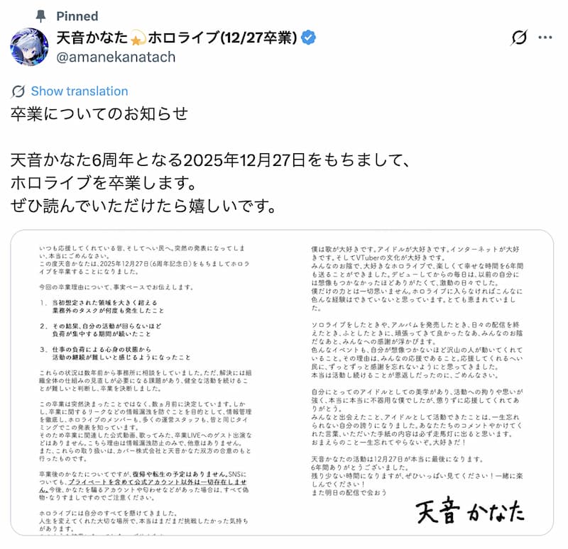 天音彼方在直播中感性表示,hololive 可說是改變她人生的恩人,在這段期間她挑戰了很多事情、實現了許多夢想,也很感謝粉絲們一路以來的支持,讓她過得非常幸福。值得一提的是,今年 8 月她才在東京有明體育館成功舉辦個人首場專場演唱會《天音彼方1st Solo Live "LOCK ON"》,展現了超高人氣。這次畢業消息僅有相關人士事前知曉,其他成員都是在直播當下才得知,畢業時官方頻道不會製作紀念短片,畢業演唱會也不會有任何嘉賓參與。天音彼方的畢業為 VTuber 界投下震撼彈,粉絲們紛紛在社群媒體上表達不捨與祝福。她強調未來將脫離娛樂產業,找份與娛樂無關的工作,希望粉絲們能尊重她的決定。畢業前的最後活動安排,預計由 hololive 官方後續公布。