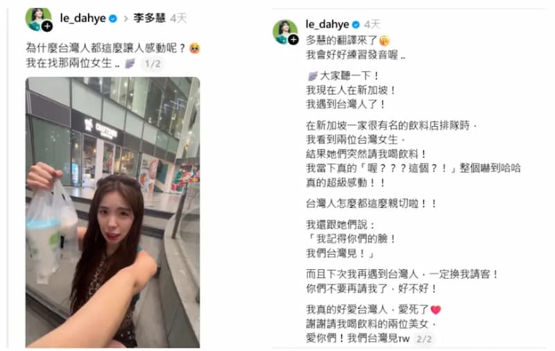 味全龍啦啦隊女神李多慧日前到新加坡旅遊,意外在名店排隊時被兩名台灣女孩認出,對方更貼心買飲料送給她,讓她感動不已。返台後,她立刻在 Threads 尋人,希望再向兩位粉絲親自致謝,並喊出「我們台灣見!」
