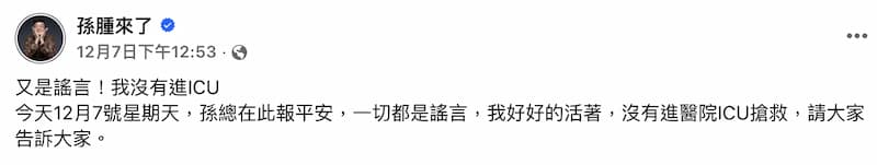資深娛樂製作人孫德榮(孫總)近期因已故愛徒于朦朧墜樓案陷入風波,不僅多次替于朦朧發聲,更因舉辦超渡法會而收到死亡威脅,被迫發出「不自殺聲明」。未料近日網路瘋傳他「吐血送醫進 ICU 搶救」,甚至有人留言指他因握有于朦朧留下的秘密而遭盯上,讓親友與粉絲相當擔憂。面對謠言一再升級,孫德榮今(7)日親自出面回應,痛罵:「我好好的活著!」