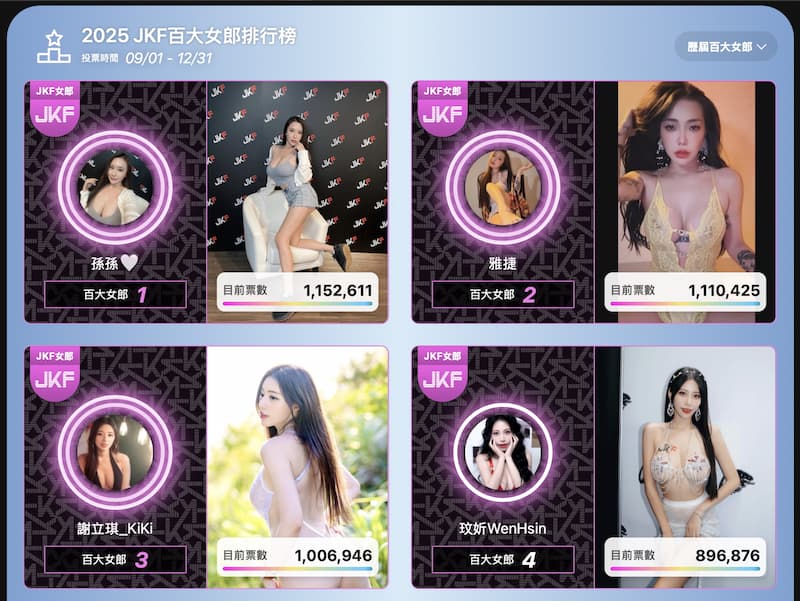 目前得票數高達 89 萬、暫居前四名的「性感小野貓」玟妡,面對最後衝刺階段,展現出模特兒兼健身教練的驚人意志力,霸氣宣告:「第一名是我的目標!」年僅 25 歲卻已是 JKF女郎中人氣實力不可忽視的存在,她不僅曾奪下「百大女郎」最具潛力新人獎、票選第二名,更曾榮獲最高榮譽的「鑽石女郎」冠軍。今年 8 月出席 TRE 台北國際成人展時,玟妡舉手投足已是女神級氣場,更以 JKF 女郎身份登上 Netflix 實境節目《人 性大不同:台灣篇》成就驚人。