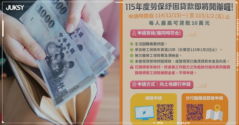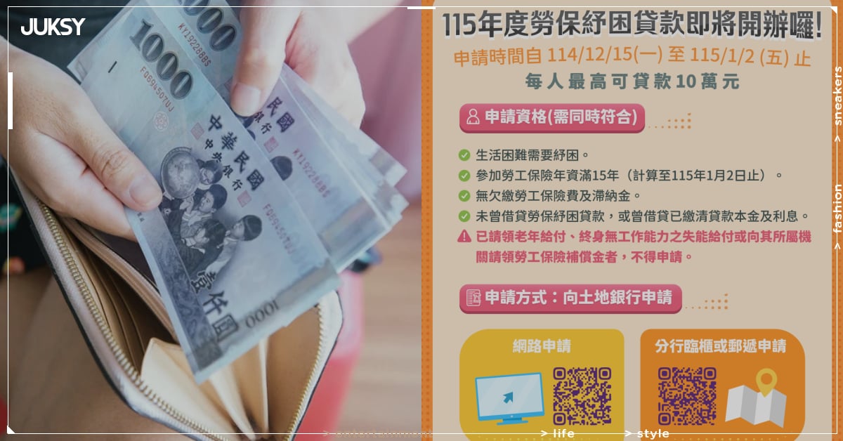 年關將近,勞動部於 2025 年 12 月 15 日正式啟動「 115 年度勞工保險被保險人紓困貸款 」,由土地銀行受理申請至 2026 年 1 月 2 日止,協助勞工朋友度過農曆年前的資金壓力,每人最高可貸 10 萬元。