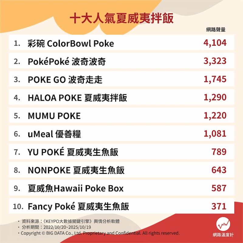 近年來,「夏威夷拌飯(Poké Bowl)」在台灣餐飲市場迅速崛起,從一開始深受健身族與輕食族喜愛,逐漸發展為上班族與中午外食族的新寵。這類餐點主打「自由配料」、「清爽不油膩」、「視覺吸睛」,強調以原型食物為基礎,將蛋白質、碳水化合物與優質脂肪巧妙結合,一碗就能達到營養均衡與飽足感,成為許多人取代便當、沙拉的輕盈正餐首選。《網路溫度計DailyView》透過輿情分析軟體《KEYPO大數據關鍵引擎》,調查近三年網路討論度,十大熱門夏威夷拌飯品牌聲量榜正式出爐!盤點出在這股輕食風潮中最受矚目的十大品牌,讓我們看見夏威夷拌飯已經不再只是小眾選擇,而是外食族的新日常。