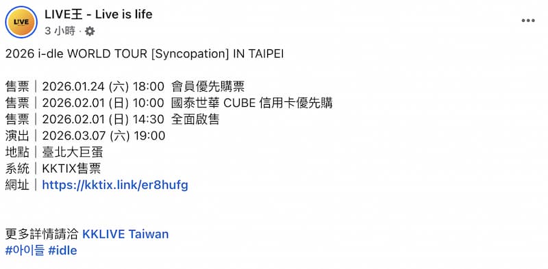 本次演唱會採 3 階段售票制,第一階段為官方會員 Berriz 優先購,購票登記時間為 1 月 16 日中午 12 點至 1 月 19 日中午 12 點,實際購票時間則在 1 月 24 日晚間 6 點至 10 點,每位會員每場限購 4 張,購票時需輸入 Membership ID,第二階段為國泰世華 CUBE 信用卡優先購,售票時間為 2 月 1 日上午 10 點至下午 1 點 59 分,僅限已完成實體卡開卡的卡友,每人每場限購 4 張,此階段座位不保證優於全面開賣,第三階段為一般民眾全面開賣,開賣時間為 2 月 1 日下午 2 點 30 分,每個 KKTIX 帳號最多 4 張,若已於前兩階段購票,總張數仍不得超過 4 張,票價分為 10 個等級,從最高 7180 元的 VIP 席,到最低 2280 元的座位席,全場均為座位席,對號入座,i-dle 的全新世界巡迴將從 2 月 21 日起從首爾展開,陸續至台北、曼谷、墨爾本、雪梨、新加坡、橫濱及香港等城市開唱,台灣場演唱會將於 3 月 7 日晚間7點在台北大巨蛋登場,粉絲們務必把握搶票時間,提前登入帳號、確認付款方式,詳細與最新公告以 KKLIVE 官方 Facebook 為準。