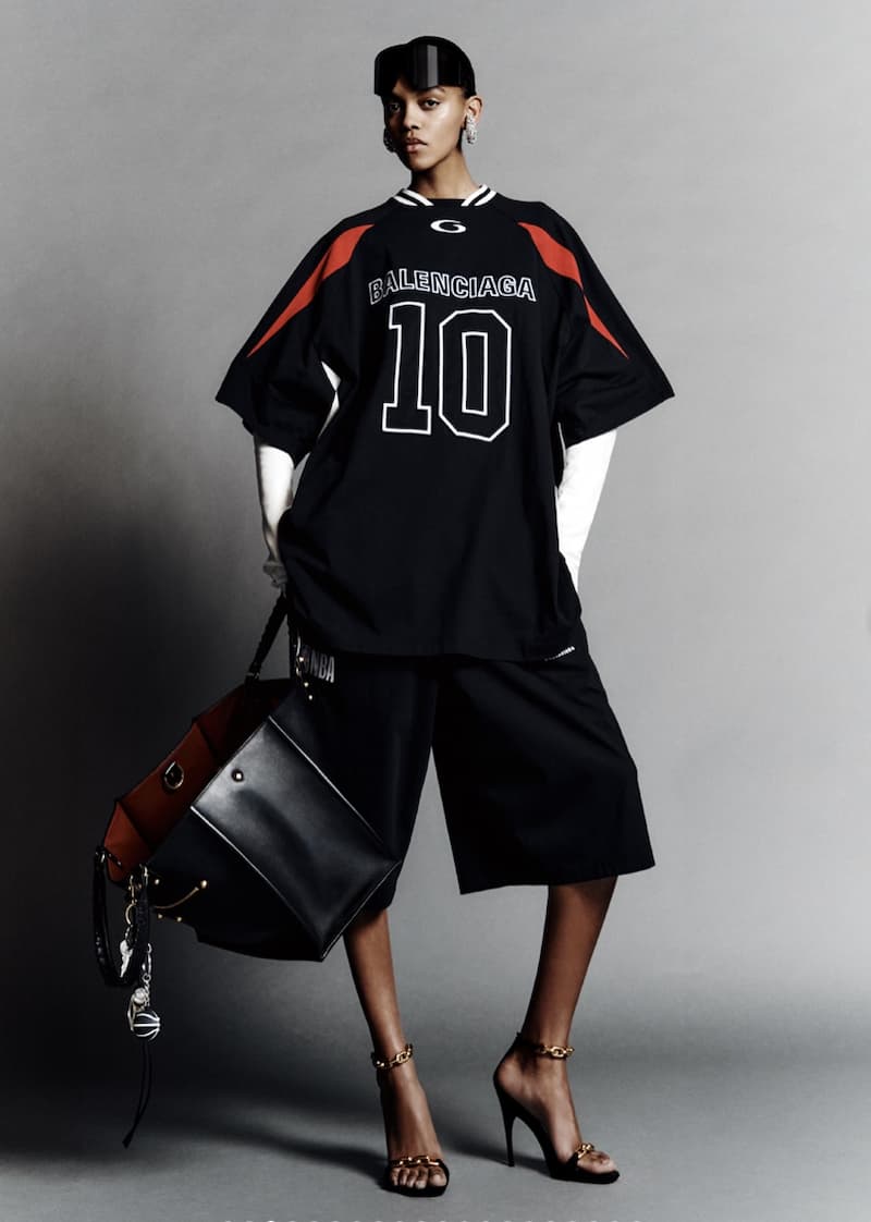 由攝影師羅賓·加里格(Robin Galiegue)在巴黎拍攝的形象照中,完整呈現皮奇歐利的最新設計美學。首次亮相的男裝系列靈感源自品牌創始人克里斯托瓦爾·巴倫西亞加(Cristóbal Balenciaga)為自己設計的作品,帶來沉穩冷靜的著裝風格。面料延續夏季系列的 neo-gazar 材質,打造出輕盈空氣感的短款大衣,展現品牌對細節的極致追求。擅長設計高級訂製禮服的皮奇歐利,將經典廓形透過皮革與運動針織面料延續,這次更推動巴黎世家首度與 NBA 聯名,帶來印有多支球隊隊徽的連帽外套、球衣與球褲,將籃球文化與街頭造型完美結合。最令人驚豔的是,機能緊身褲竟搭配莫諾羅·伯拉尼克聯名高跟鞋,這種大膽混搭為高奢運動風樹立全新里程碑,也展現創意總監打破框架的決心。